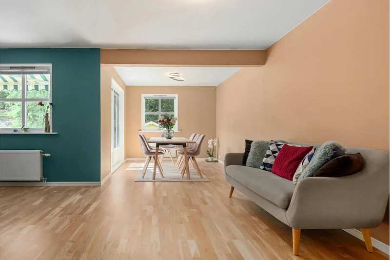 風格提案: 大面積淺色木地板搭配低飽和度色調。為了因應宜蘭潮濕氣候,選用防潮性佳的超耐磨地板與呼吸漆料。
